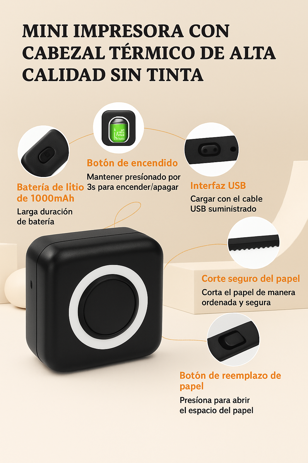 ✅ Diseño práctico y seguro – Botón de encendido, corte limpio del papel y fácil reemplazo de rollo.